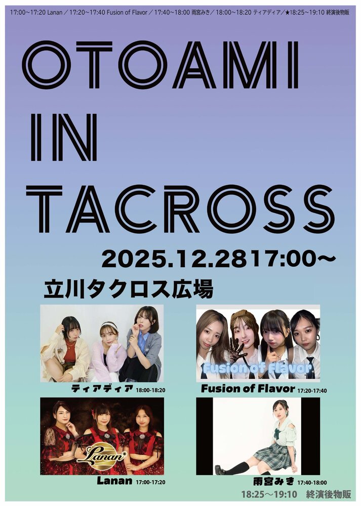 ティアディアライブ@OTOAMI in タクロス SCHEDULE 2025/12/28(日) 2025年12月28日(日)「OTOAMI IN TACROSS」観覧無料 荒天中止 会場:立川タクロス広場時間:開演 17:00〜、終演後部版 18:25-19:10 出演者(順不同)ティアディア/Fusion of Flavor/Lanan/雨宮みき URLをコピーする 報告する